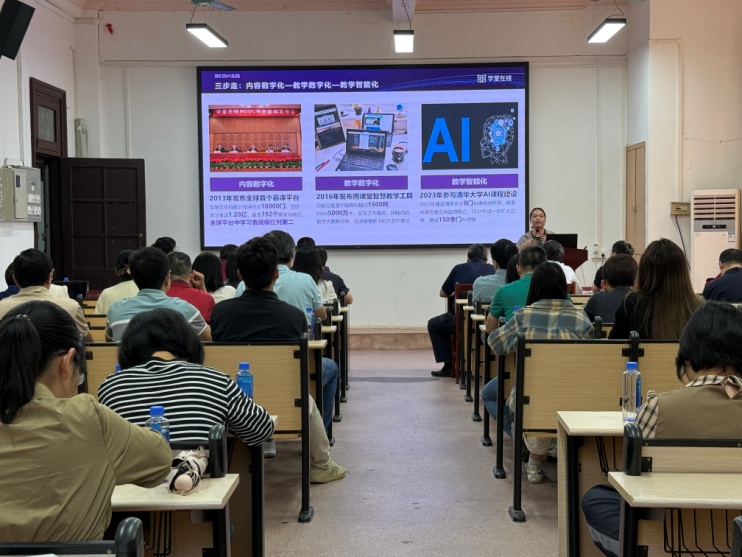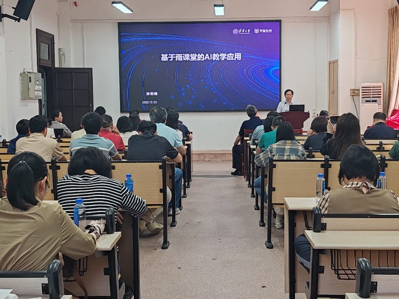 随后,活动特邀雨课堂资深培训师张利楠开展《基于雨课堂的AI教学应用》专题讲座。她结合自身丰富的教学实践经验,系统介绍了“雨课堂”智慧教学工具的核心功能,并重点演示了AI技术在课堂互动、学情分析、智能评测等方面的创新应用。她通过真实教学案例,生动展示了如何利用AI实现个性化教学、实时课堂管理和和教学反馈等功能。