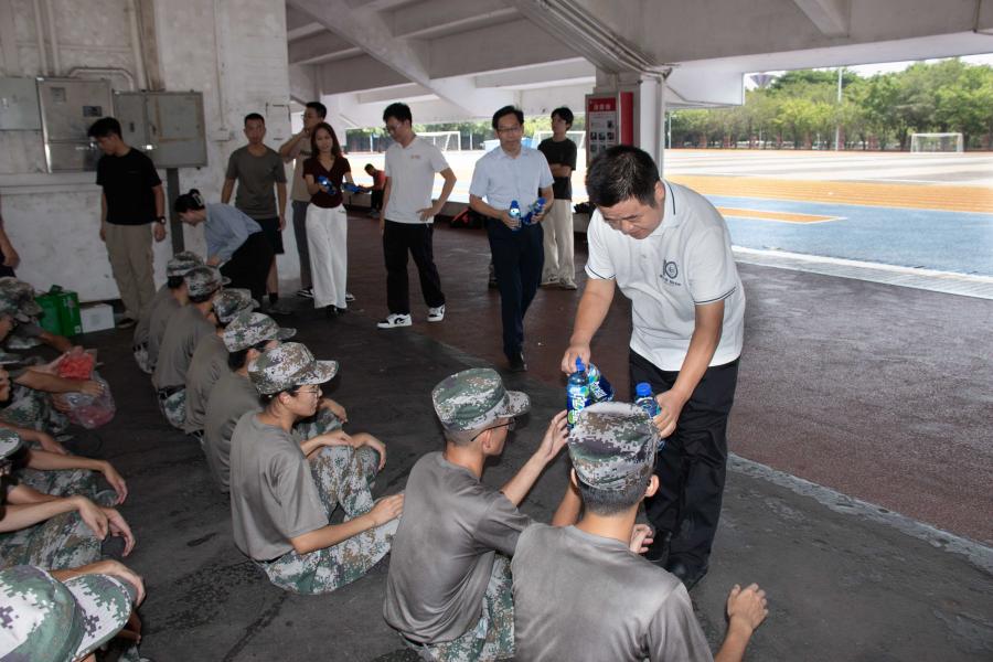 在现场,学院领导老师对学员精神风貌表示高度的肯定,现场分发润喉糖、牛奶、功能饮料等慰问物资,并与学员们展开亲切交流,询问训练情况和生活状况,强调身体安全第一位,鼓励学员们积极进取,传承发扬电智优秀精神,为新生军训做好准备。