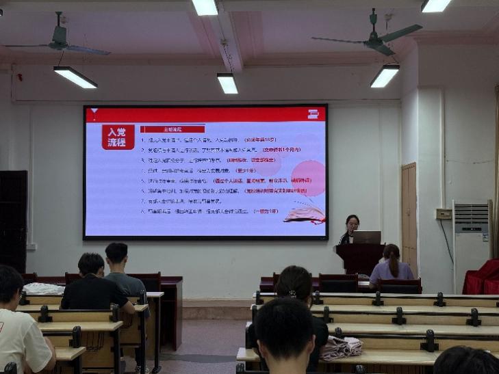 学院党务工作中心贾佳同学向助班朋辈们分享了2025级新生入党相关工作,并着重讲解了入党流程、如何撰写入党申请书等重要内容。