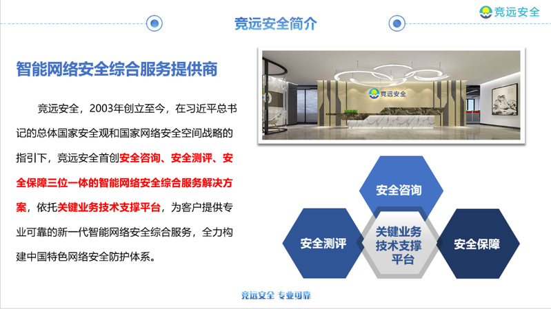 广州竞远安全技术股份有限公司成立于2003年,专注耕耘网络安全服务领域十八载,首创安全咨询、安全测评、安全保障三位一体的智能网络安全综合服务解决方案,致力于构建中国特色网络安全防护体系。现有员工超过600人,总部位于广州,在北京设立子公司,全国设有 23 个分支机构,是华南地区最大的安全服务公司。