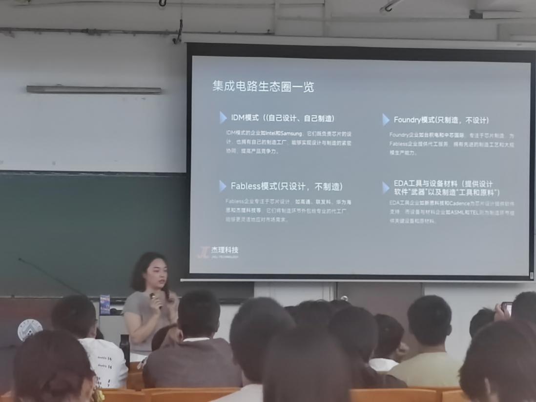 在讲座中,王丹总监以生动案例揭开芯片世界的奥秘,从基本概念、制造流程到应用场景,深入浅出地展现了芯片如何成为现代社会的“智能心脏”。她梳理了行业格局,介绍了不同细分领域的发展前景,并结合自身经历分享职业路径与成长体会。她鼓励同学们立足当下,扎实学习,保持创新精神,并为职业规划提供了具体建议。随后,她还介绍了杰理科技的研发成果与企业文化,拓宽了学生们对行业和企业的认识。
