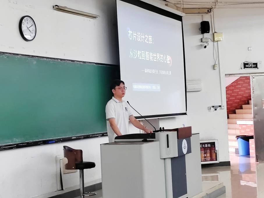 2025年9月22日下午,电子工程学院(人工智能学院)微电子工程系在第三教学楼412室举办专题讲座《芯片设计之旅:从沙粒到智能世界的心脏》。讲座特邀珠海市杰理科技股份有限公司人力资源总监、我院2025级集成电路设计与集成系统专业成长导师王丹担任主讲嘉宾。学院党委副书记梁耀明主持活动,微电子工程系刘洪山、谢家兴、梁亨茂等教师代表,集成电路设计与集成系统专业全体学生、电子科学与技术专业部分学生参与了此次讲座。