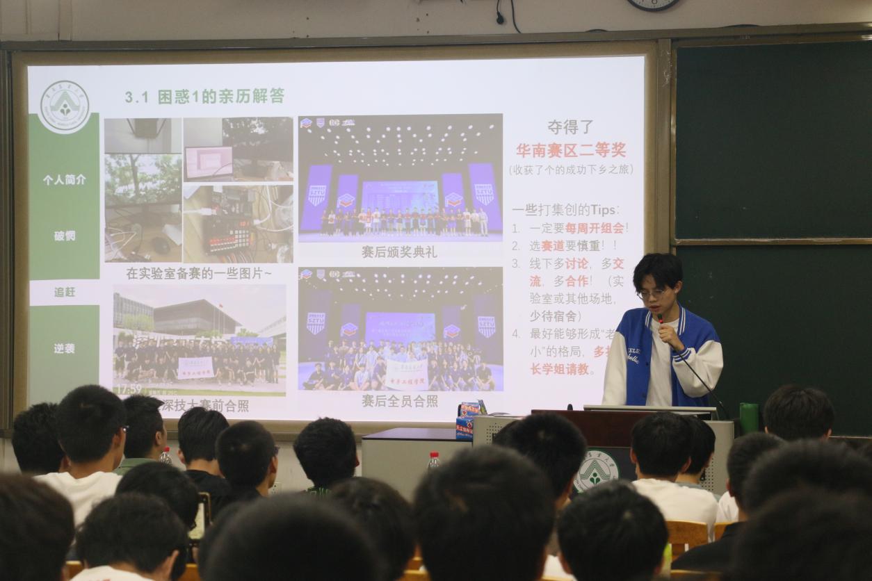 保研至华南理工大学的李东峻向大家展现了他从土木专业转战电科专业,一路适应新生活的经历和做法。他直言在学习之余也要“保持原状态,感受生活”以此缓解焦虑,并针对大一新生提供了相应的进阶建议。推免至中山大学的邹明杰针对如何“从高中思维转向大学思维”,介绍了如何以自我为“源动力”主动作为,有规划地前行,他以“确立目标”为始发点,给同学们提供了宝贵的自我管理方法和保研指导。