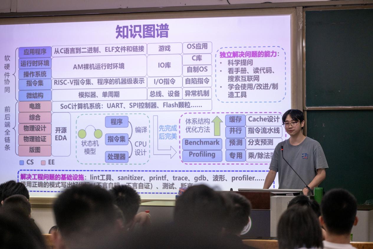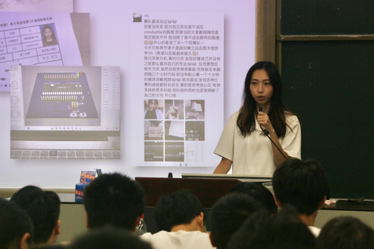连续两年获得校一等奖学金的胡琳从自己刚入大学“没有目标,什么都想去尝试”的状态出发,指出“专注去做一件事情”的重要性。从学术比赛到不断完善简历,在企业中学习进步,她以生动的例子鼓励同学们“勇敢迈出第一步”。两次获集创赛国奖的唐泽华向大家详细介绍了“一生一芯”计划的学习内容和开展意义。从软硬件协同到前后端全链条,从“超级玛丽”到“仙剑奇侠传”,他以理论和案例全面地展现了该项目的目标和相关资源,欢迎同学们一同加入学习小组,共同发展进步。