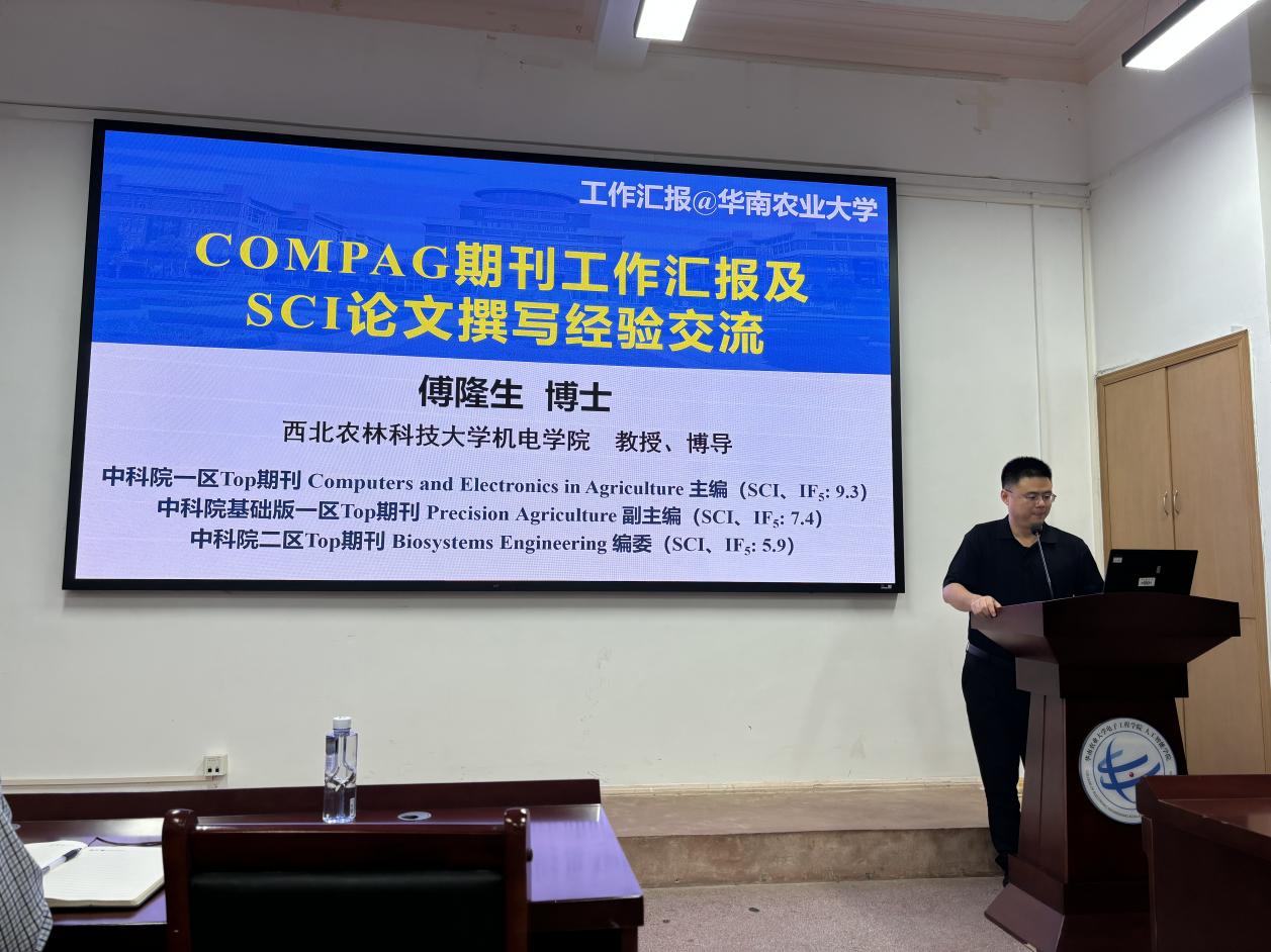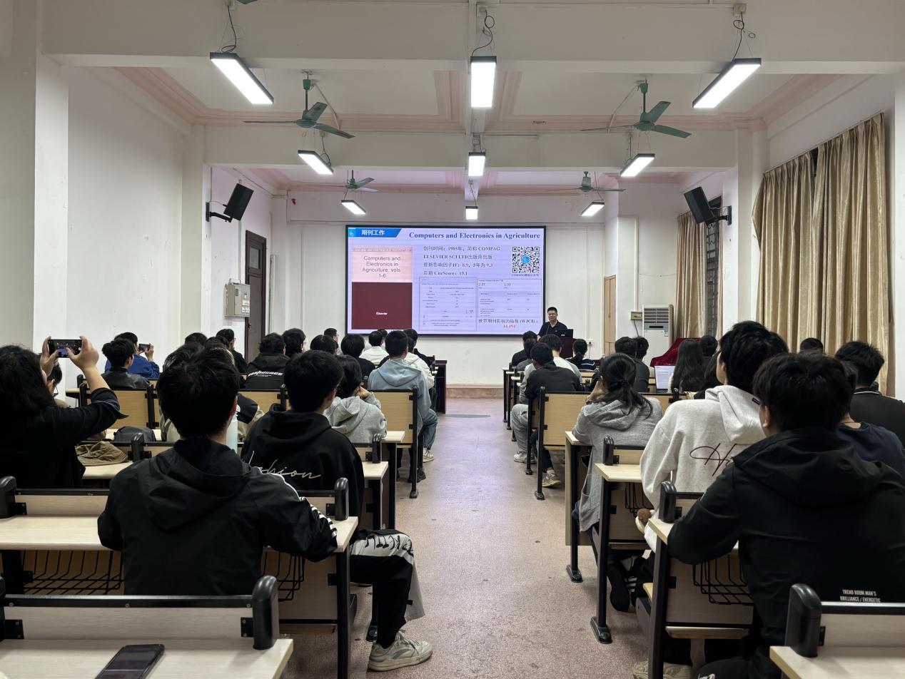 12月2日上午,由我院主办的学术报告暨2026年度国家自然科学基金申报辅导交流会在学院207会议室顺利举行。本次报告会特邀西北农林科技大学教授、国际知名学术期刊《Computers and Electronics in Agriculture》主编傅隆生教授作为主讲嘉宾,为广大师生带来题为“COMPAG期刊工作汇报及SCI论文撰写经验交流”的精彩报告。学院副院长吕石磊主持会议,副院长陆健强出席,学院青年教师、研究生共计80余人参加了本次会议。