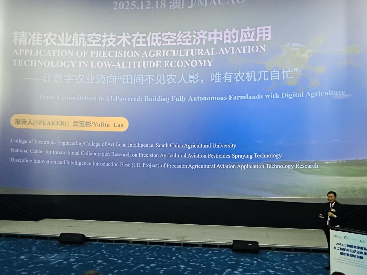作为国家精准农业航空施药技术国际联合研究中心主任,我院兰玉彬教授长期深耕低空经济相关领域的科研与成果转化工作。他以《精准农业航空技术在低空经济中的应用》为题做了报告,报告表示,精准农业航空是低空经济在农业领域的重要应用方向,其技术创新与标准化发展直接关系到农业现代化水平的提升;同时,人工智能技术与精准农业航空的深度融合,能够有效提升作业效率与精准度,为低空经济产业的细分领域规范化发展提供支撑,高校应充分发挥多学科交叉优势,推动技术创新与标准制定协同推进,助力低空经济产业高质量发展。