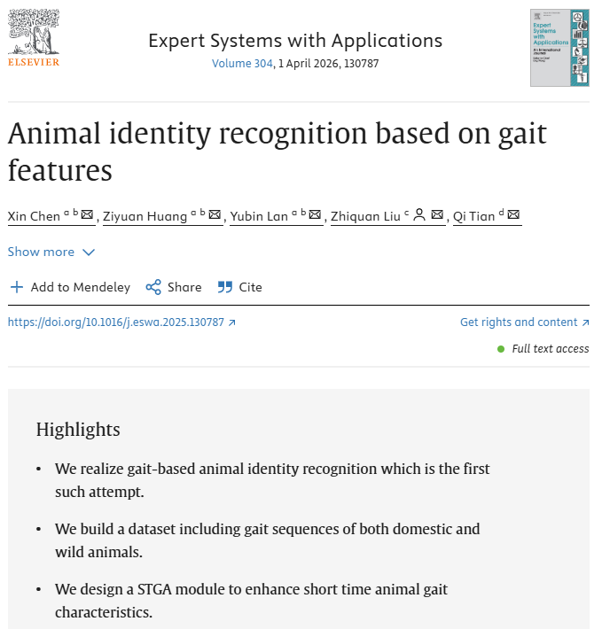 近日,我院陈欣副教授在人工智能顶级期刊Expert Systems with Applications(ESWA,中科院一区)发表题为“Animal identity recognition based on gait features”的研究论文(论文链接:https://www.sciencedirect.com/science/article/pii/S0957417425044021?dgcid=coauthor)。其中,陈欣副教授为文章第一作者,华南农业大学兰玉彬教授、暨南大学刘志全教授、华为云田奇教授为文章合作作者。