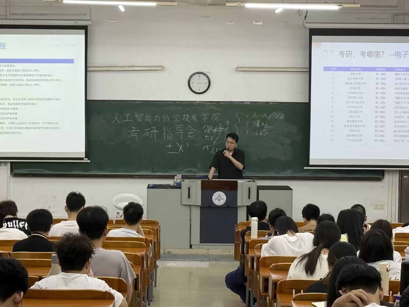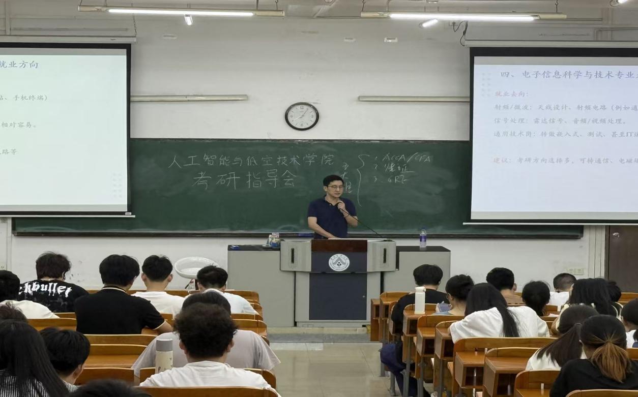为进一步做好学生升学规划,帮助学生明确升学目标、优化备考路径,夯实学业与职业发展基础,2026年4月16日晚,人工智能与低空技术学院学生会联合高顿教育在教三开展2024级考研专项指导会。本次会议特邀高顿教育副总裁李超、升学规划师吴思雨担任主讲,年级辅导员梁明珠老师及2024级全体同学参会。