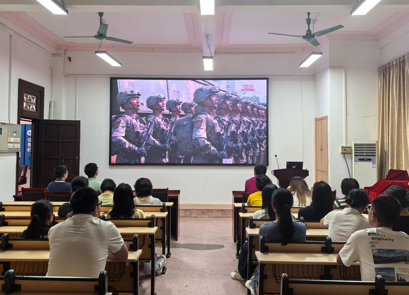 学院统筹安排、有序组织,分别在院楼207会议室、华山学生活动中心、社区服务中心及教三多个课室设立集中观看点。全院教职工、各党团支部成员、团委学生骨干及2025级新生踊跃参与,全程聚精会神收看直播。当受阅部队迈着铿锵有力的步伐经过天安门广场,一架架战机呼啸掠过,一件件现代化装备庄严亮相,现场不时传来阵阵赞叹与热烈掌声,浓厚的自豪感洋溢在每一处收看现场。